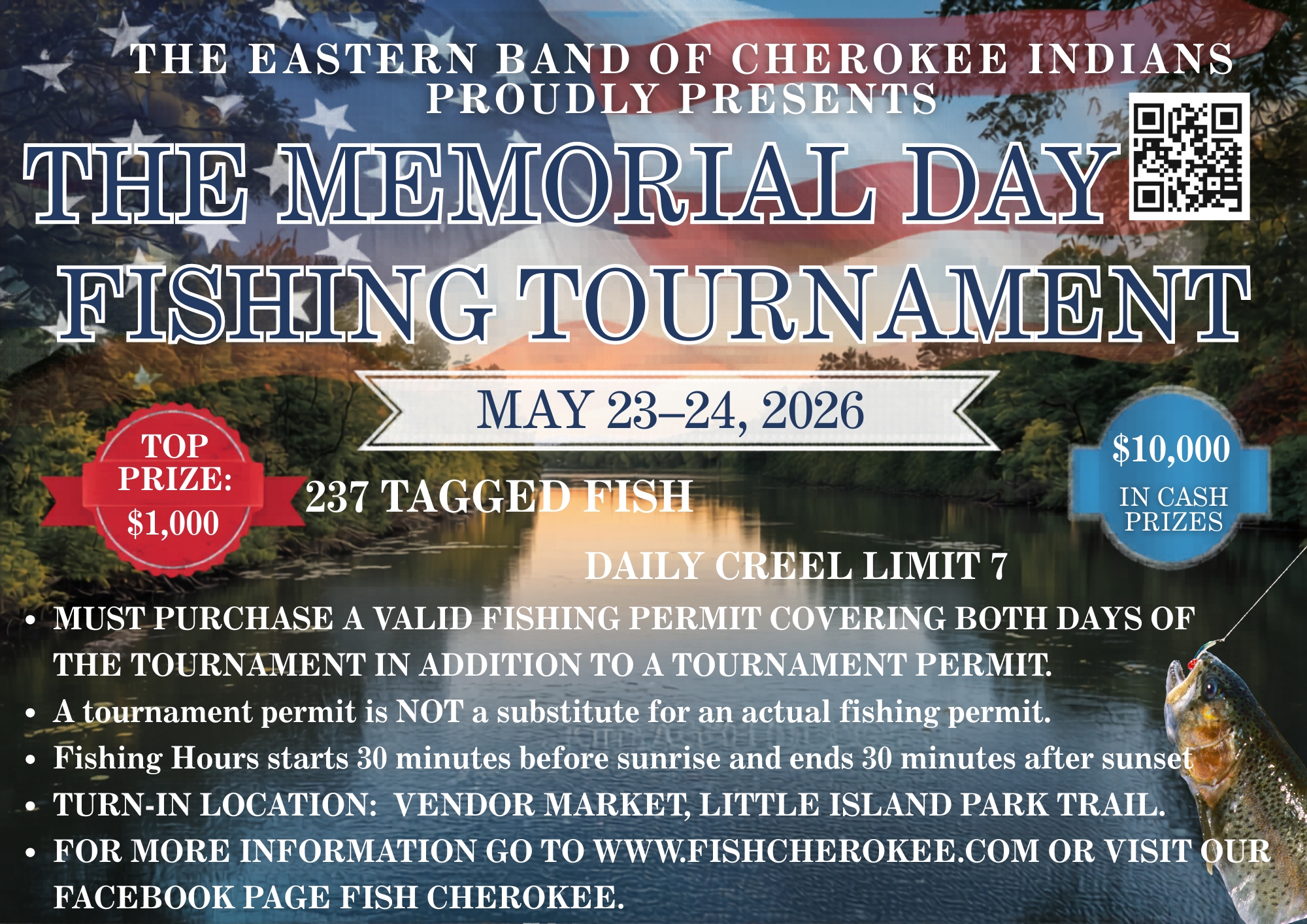 May 23-24, 2026 237 Tagged Fish Will Be Stocked. Creel Limit is 7. $10,000.00 in Cash Prizes.