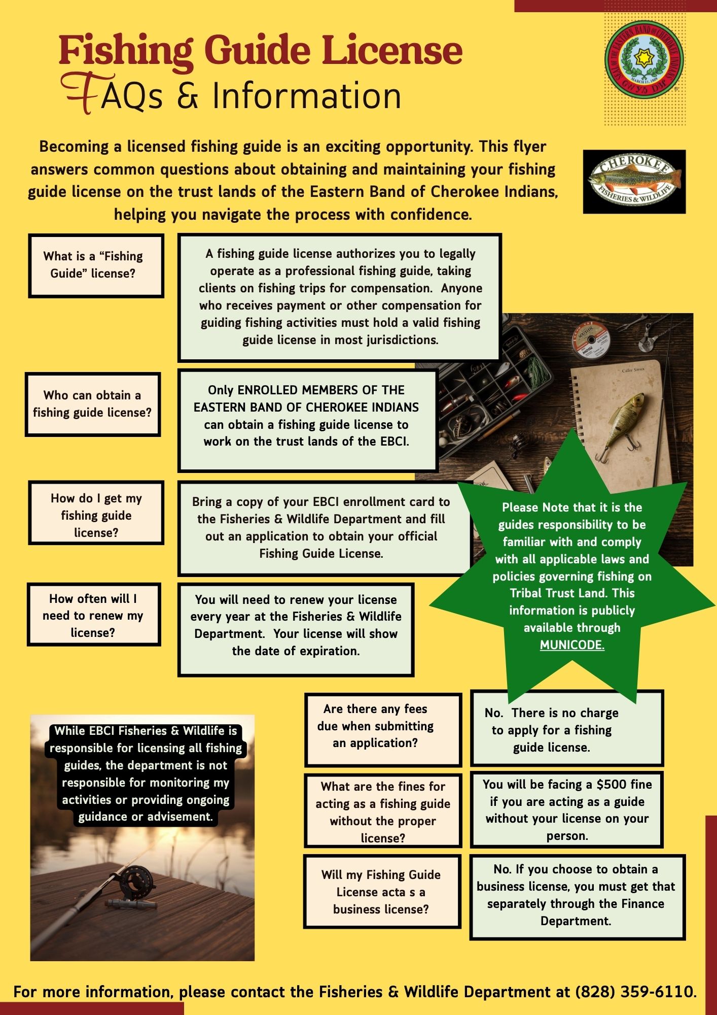Pursuant to Ordinance 108 (2026), only enrolled members of the Eastern Band of Cherokee Indians may act as a fishing guide on Tribal Trust Lands.